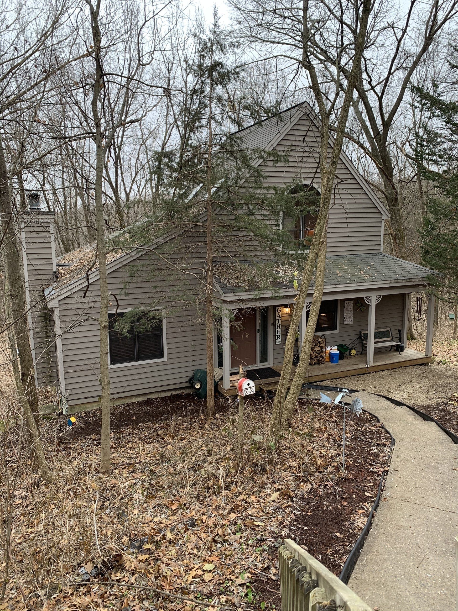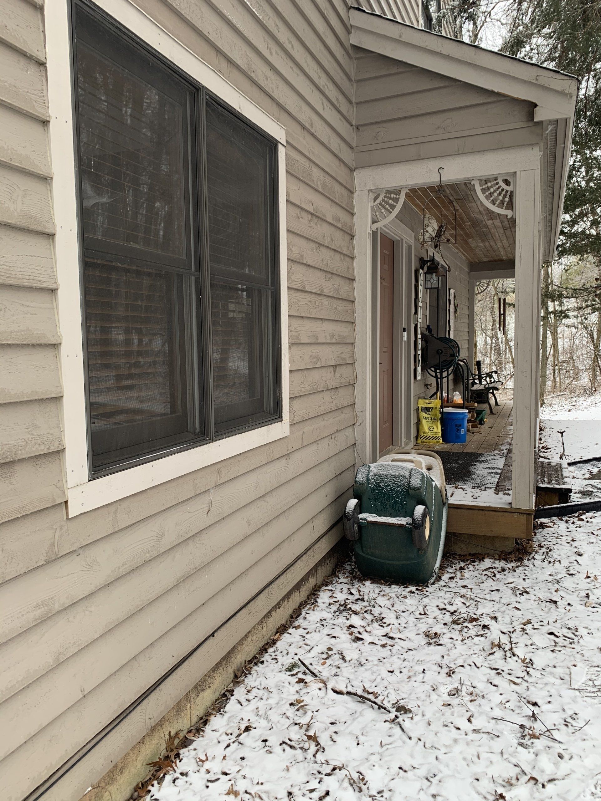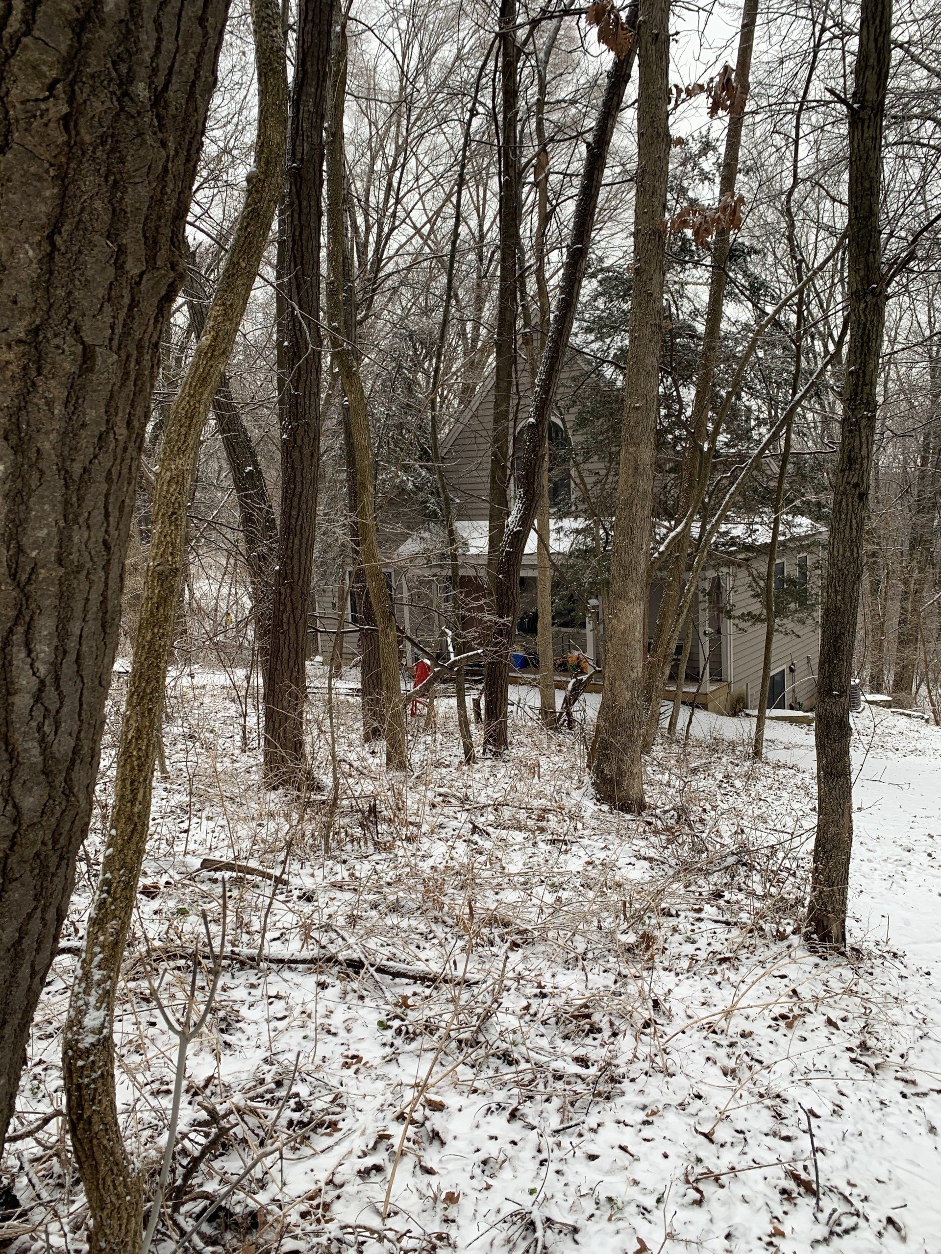It is a Wintery, snowy afternoon. But, in the Spring, Summer, and Fall the backyard is a beautiful lush green with area enough to spread out and take in the nature.